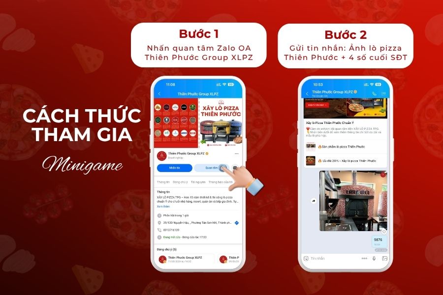 Sau khi quan tâm Zalo OA, quý khách gửi tin nhắn vào Zalo OA với nội dung gồm ảnh chụp lò pizza Thiên Phước đang sử dụng kèm theo 4 số cuối số điện thoại của mình.